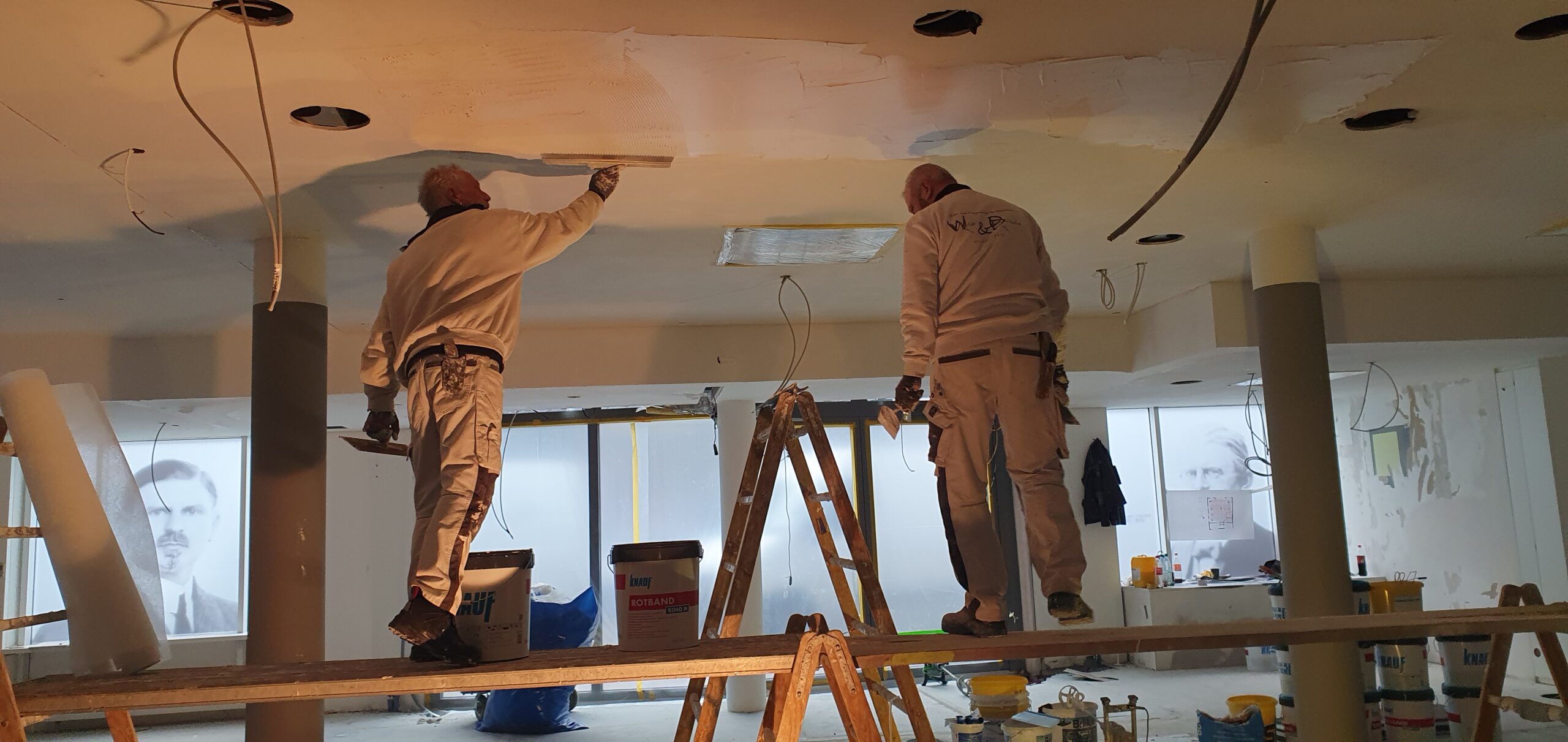 Mit hohem Arbeitseinsatz werden auch die Decke, alle Wände und der Boden der Ausstellungsfläche saniert. Dafür sind viele Arbeitsschritte notwendig, wie etwa das Entfernen alter Vliesreste, umfangreiches Verspachteln und anschließendes Abschleifen der Flächen oder auch Probeanstriche für die Abnahme des Farbkonzeptes und die Bemusterung von Materialien und Gestaltungselementen. Für unsere Trockenbauer ist es eine scheinbar mühelose Selbstverständlichkeit, auf Leitern und Stegen balancierend ihr Tagwerk zu verrichten, so dass wir nahezu stündlich erleben, wie schnell aus einer Baustelle eine saubere Hülle für den Aufbau der Ausstellungsbereiche wird.