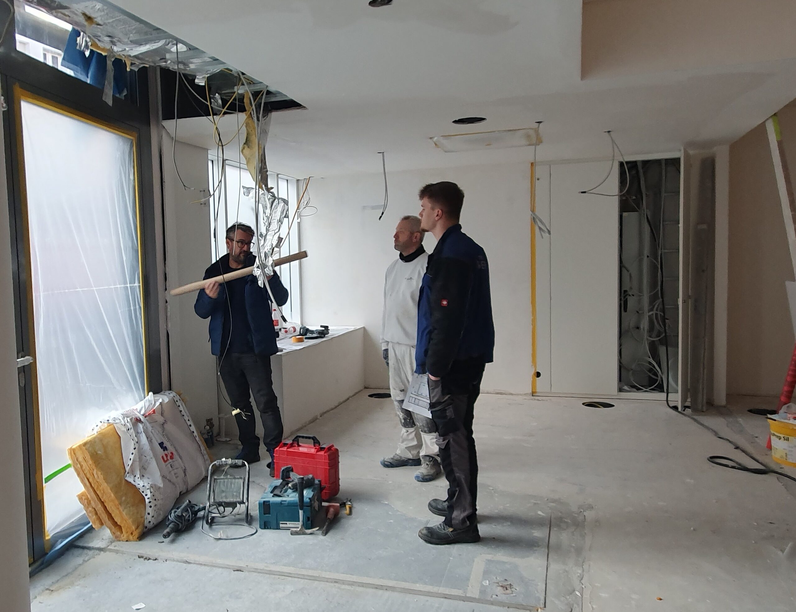 The ceiling, all the walls, and the floor of the exhibition area are also being renovated with a great deal of effort. This requires many steps, such as removing old facing residues, extensive filling and subsequent sanding of the surfaces, as well as test coatings for the approval of the color concept and the sampling of materials and design elements. For our drywallers, it seems effortless and natural to balance on ladders and walkways as they go about their daily work, so that we can see almost hourly how quickly a construction site is transformed into a clean shell for the construction of the exhibition areas.