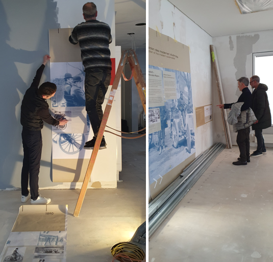 All implementation work has been preceded by intensive planning and regular meetings of the international project team so that important decisions can be made directly on site. We have long since left the conceptual stage behind us and are now in the final stages of the construction phase. The main item on the agenda at the last meeting was the approval of the color concept for the spatial design of the exhibition depot. To this end, museum designer Raimund Docmac arranged for a sample coat of paint to be applied to the ceiling and walls and brought along test prints of his graphic layouts. These were placed for review in order to evaluate text hierarchies, font sizes, and color contrasts. Only when we can ensure that different visitor groups can easily perceive and read the graphics and texts as an important means of communicating the history of Maybach will the print approval be granted.