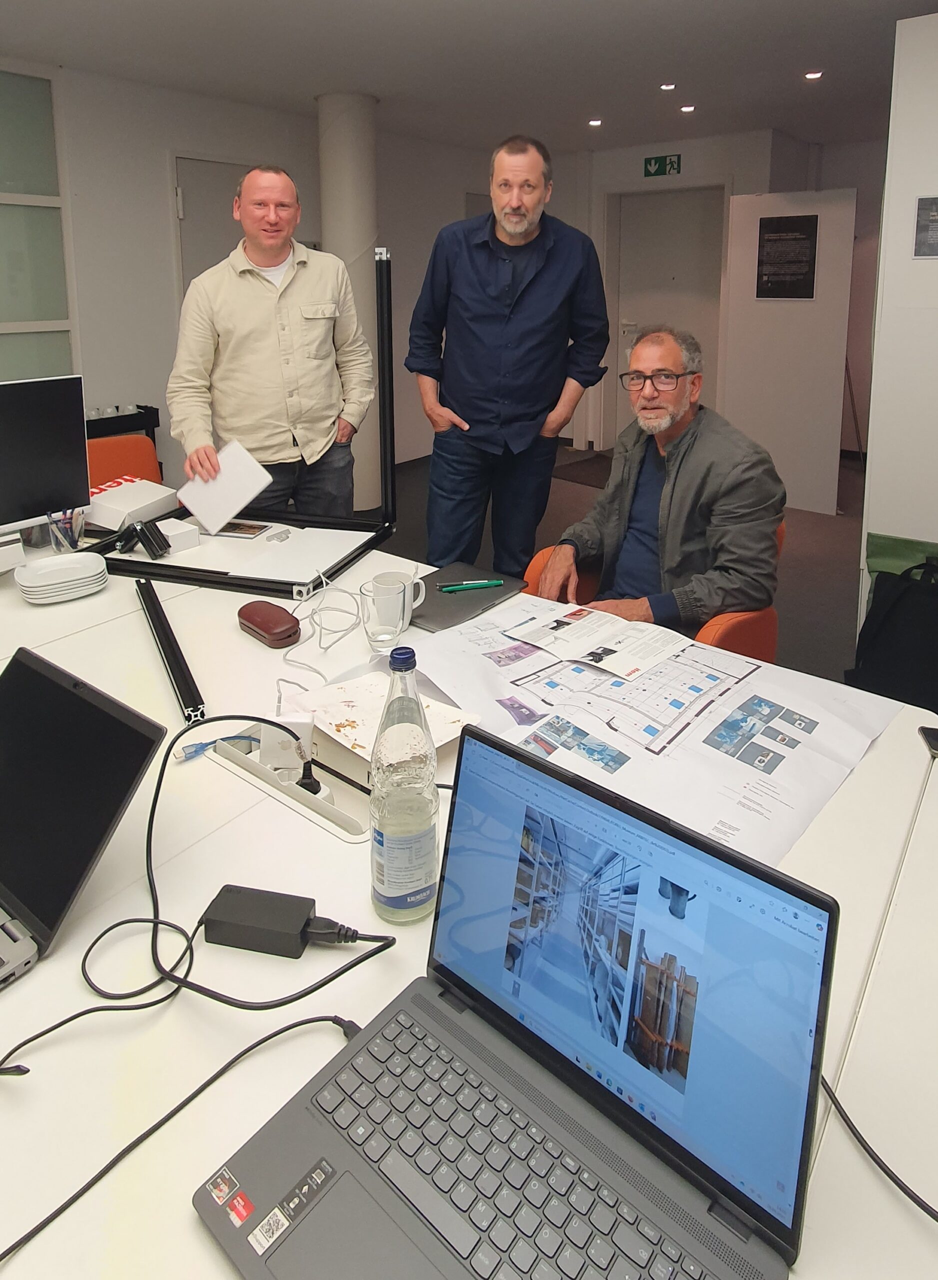 From right: Museum designer Raimund Docmac, graphic designer Boris Pius Müller, and curator Tobias Erne at a planning meeting for the Maybach exhibition depot: discussing the correlation between text and images in the context of scenography and exchanging ideas about depot furniture. Photo: Maybach Foundation