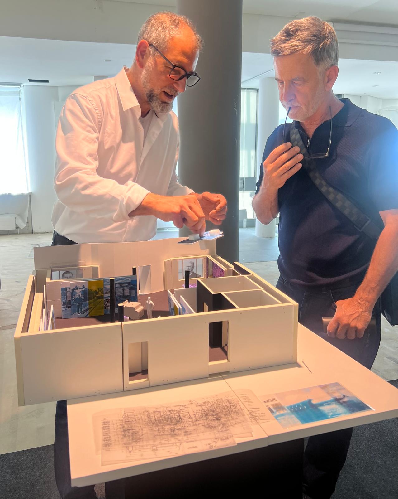 Museum designer Raimund Docmac (left) discusses the design concept for the Maybach exhibition depot with Uli Schmid-Maybach using a 3D model. Together, they consider the functionality of the scenography elements directly in the new premises. Photo: Maybach Foundation